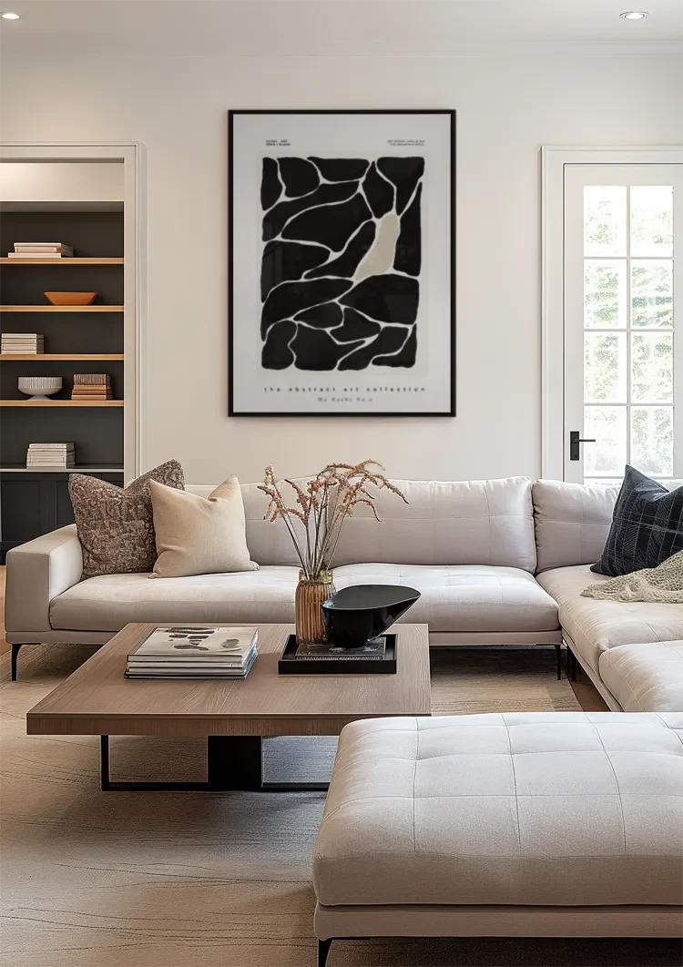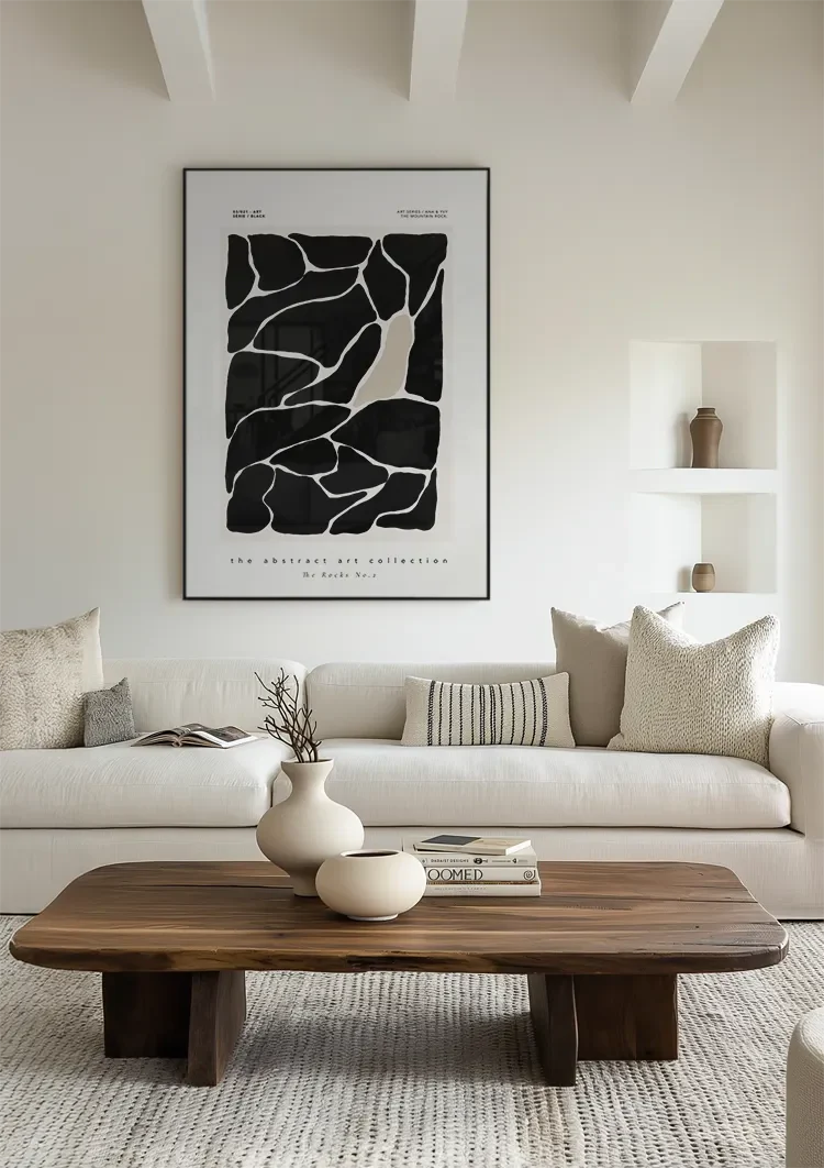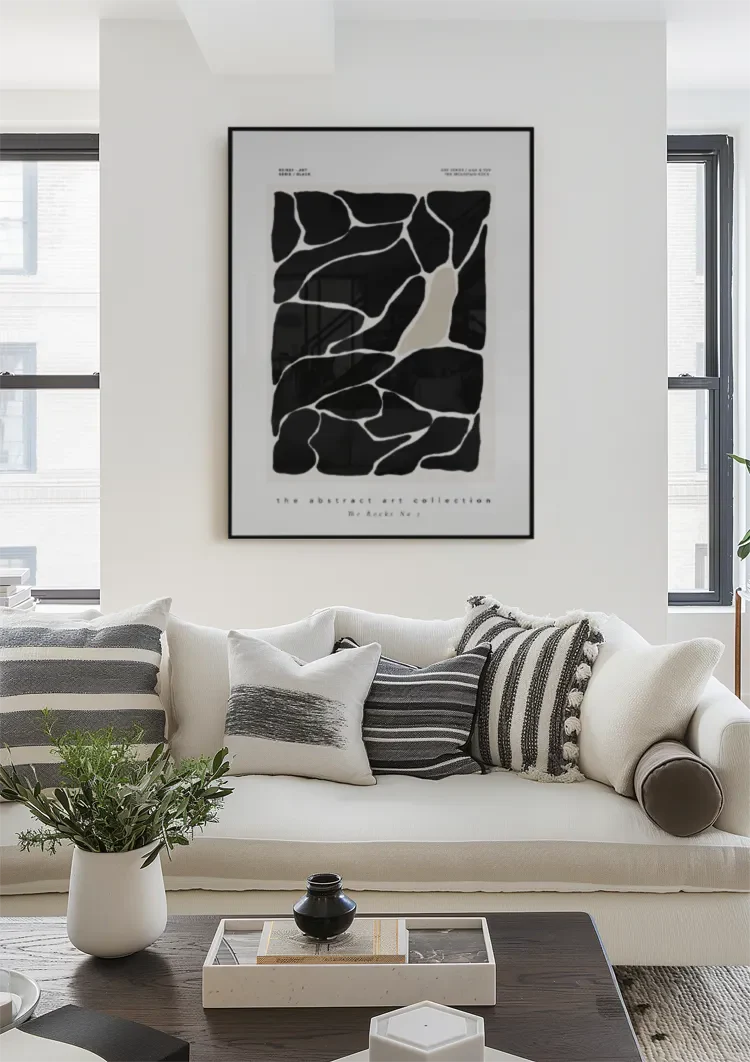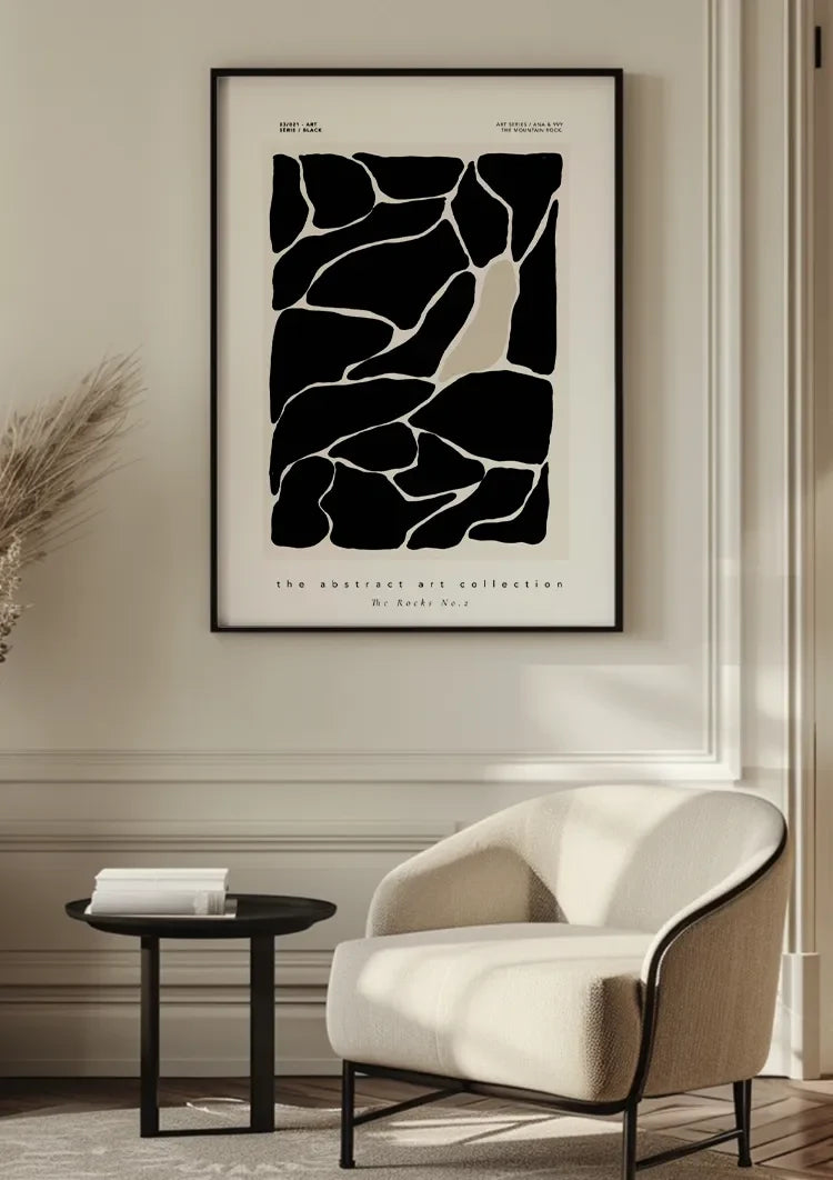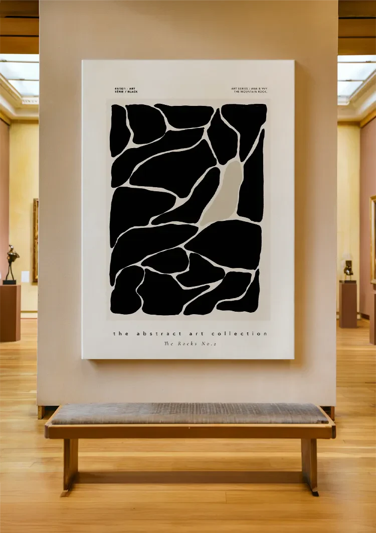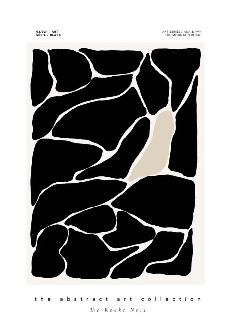 Dieses Gemälde zeigt abstrakte schwarze organische Formen, die an Felsen erinnern, getrennt durch weiße Linien und Öffnungen. Der Kontrast zwischen den dunklen Flächen und hellen Zwischenräumen erzeugt einen starken grafischen Effekt mit einem modernen Erscheinungsbild.