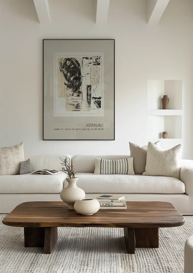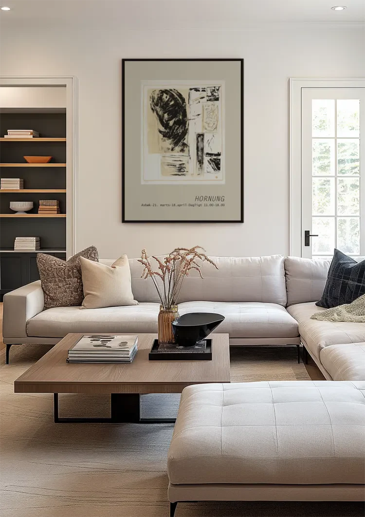 Dieses Gemälde zeigt ein abstrakt-expressionistisches Werk mit schwarzen gezeichneten Formen und dem Wort „Hornung“ auf einem warmen beigefarbenen Hintergrund. Die locker gezeichneten Linien und typografischen Elemente verleihen dem Werk einen künstlerischen, grafischen Charakter.