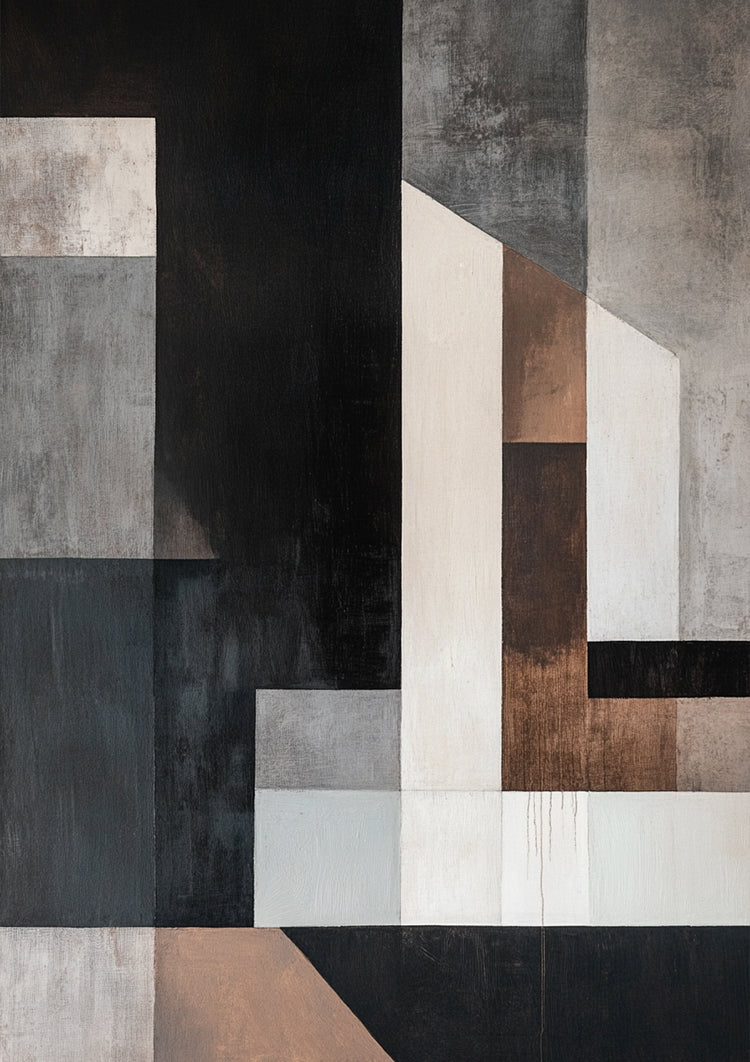 Dieses Gemälde zeigt abstrakte geometrische Formen in neutralen Tönen von Schwarz, Grau, Weiß und Erdtönen. Die überlappenden Rechtecke schaffen ein modernes und architektonisches Design, das zu einem schlichten und minimalistischen Interieur passt.