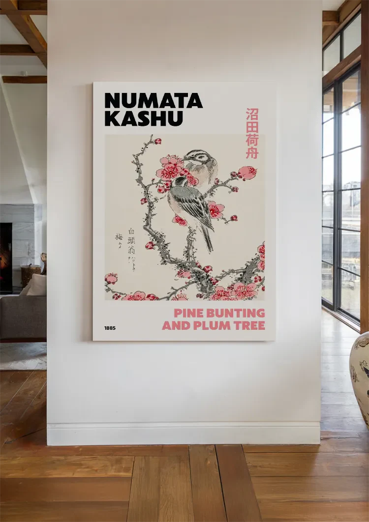 Dieses Gemälde zeigt einen Vogel, der auf einem blühenden Pflaumenbaumast mit roten und rosa Blüten sitzt, von Numata Kashu. Die zarte Komposition strahlt Ruhe und Naturschönheit im japanischen Stil aus. Das Werk ist auf Leinwand, Dibond und Acrylglas erhältlich und wird in mehreren Formaten nach Maß gefertigt.