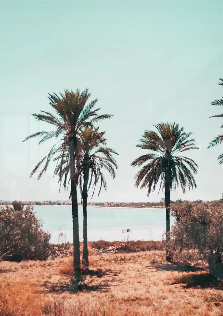 Dieses Gemälde zeigt zwei zierliche Palmen, die sich vor einem strahlend pastellblauen Himmel abheben. Die minimalistische Komposition und die sanften Farben schaffen eine ruhige, tropische Sommeratmosphäre, die von warmen Strandurlauben träumen lässt.