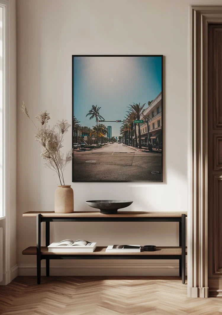 Dieses Gemälde zeigt einen ruhigen Boulevard mit Palmen und Ampeln unter einem strahlend blauen Himmel. Die sonnige, leere Straße mit Gebäuden auf beiden Seiten strahlt eine friedliche, sommerliche Atmosphäre aus.