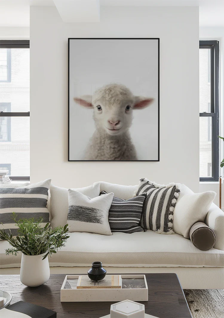 Dieses Gemälde zeigt eine Nahaufnahme eines niedlichen Lamms mit lockiger weißer Wolle und rosa Ohren auf einem weißen Hintergrund. Ein minimalistisches und bezauberndes Porträt. Das Werk ist auf Leinwand, Dibond und Acrylglas erhältlich und wird in mehreren Formaten nach Maß gefertigt.