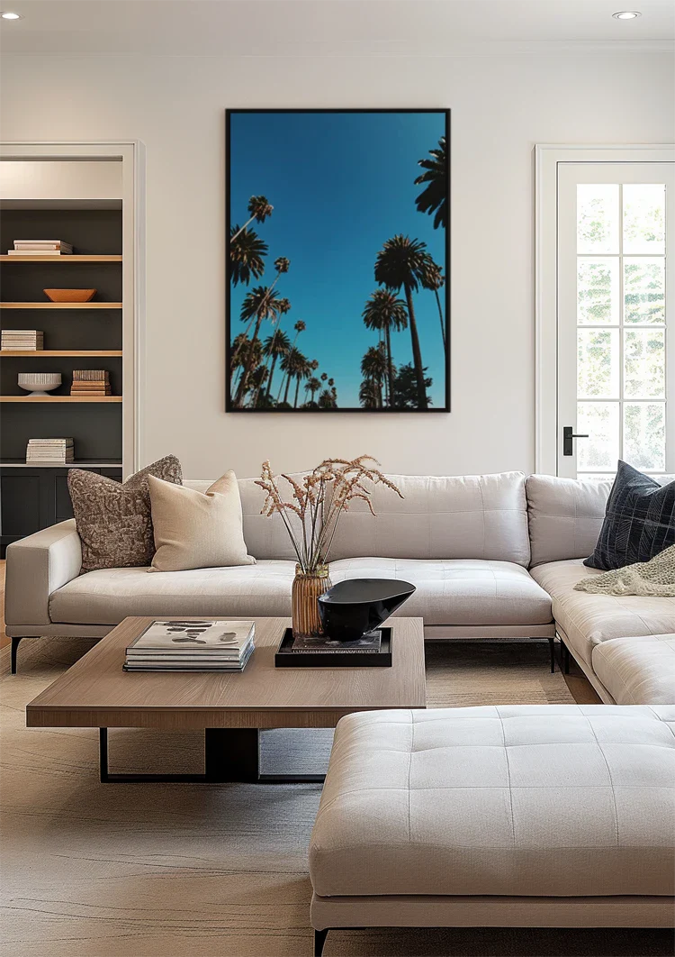Dieses Gemälde zeigt schlanke, hohe Palmen, die an einem strahlend sonnigen Tag in einen tiefblauen Himmel ragen. Die vertikale Komposition und die hellen Farben verleihen dem Werk einen frischen und lebendigen Charakter. Das Werk ist auf Leinwand, Dibond und Acrylglas erhältlich und wird in verschiedenen Formaten nach Maß gefertigt.