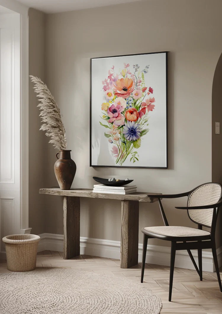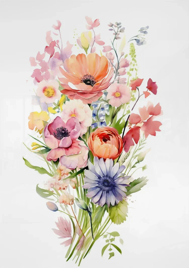 Dieses Gemälde zeigt einen farbenfrohen Aquarellstrauß mit Anemonen, Mohnblumen sowie lila und orangefarbenen Gartenblumen. Ein lebendiges und detailliertes Blumenarrangement. Das Werk ist auf Leinwand, Dibond und Acrylglas erhältlich und wird in mehreren Formaten nach Maß gefertigt.