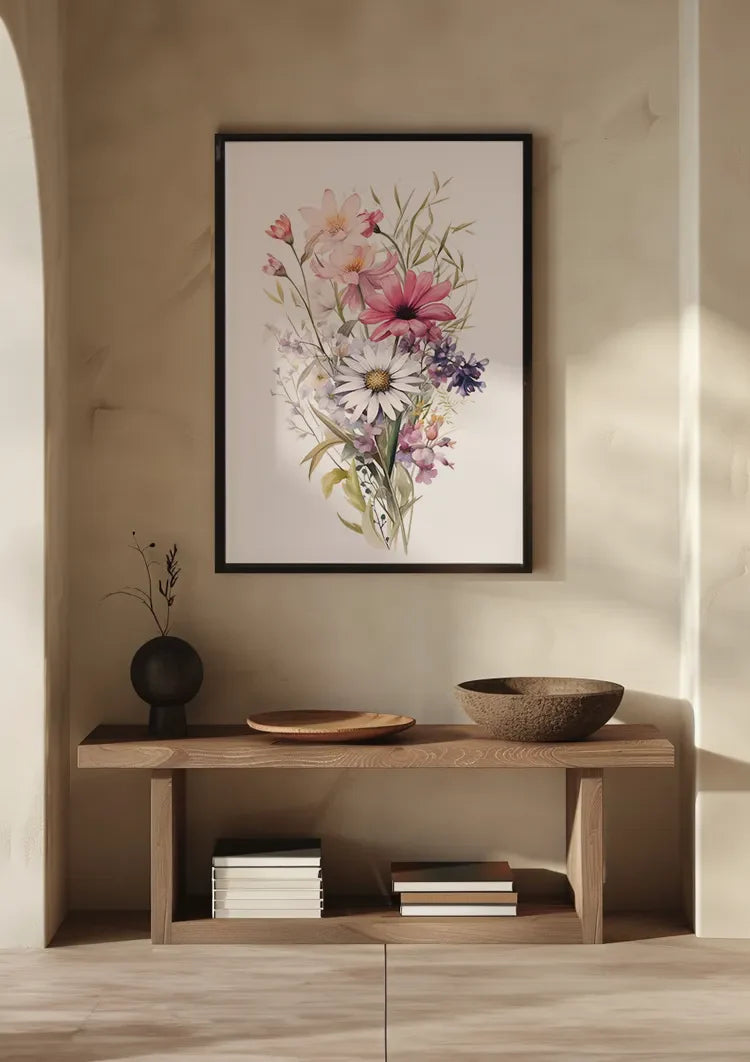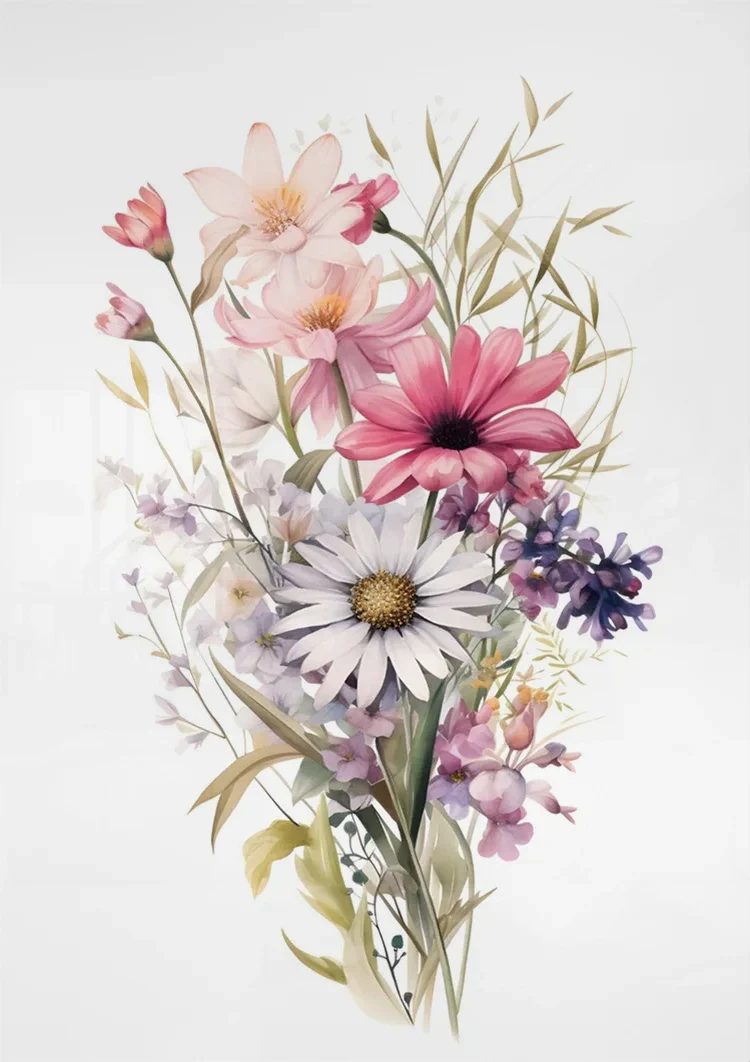 Dieses Gemälde zeigt einen zarten Aquarellstrauß mit Gänseblümchen, Mohnblumen und Wildblumen in Rosa, Lila und Weiß. Der sanfte Stil strahlt Ruhe und Eleganz aus. Das Werk ist auf Leinwand, Dibond und Acrylglas erhältlich und wird in mehreren Formaten nach Maß gefertigt.