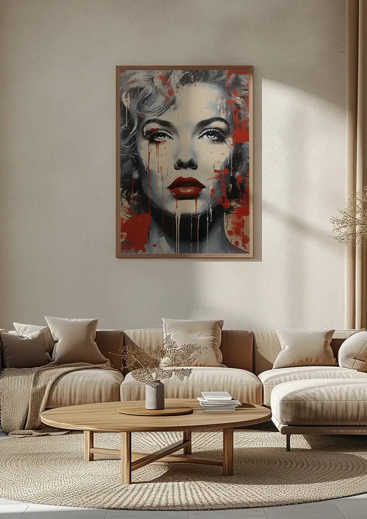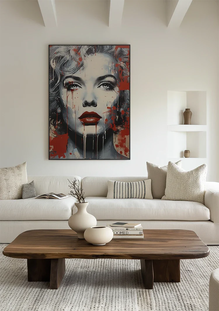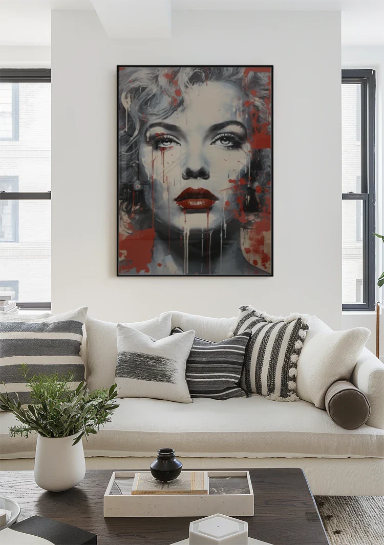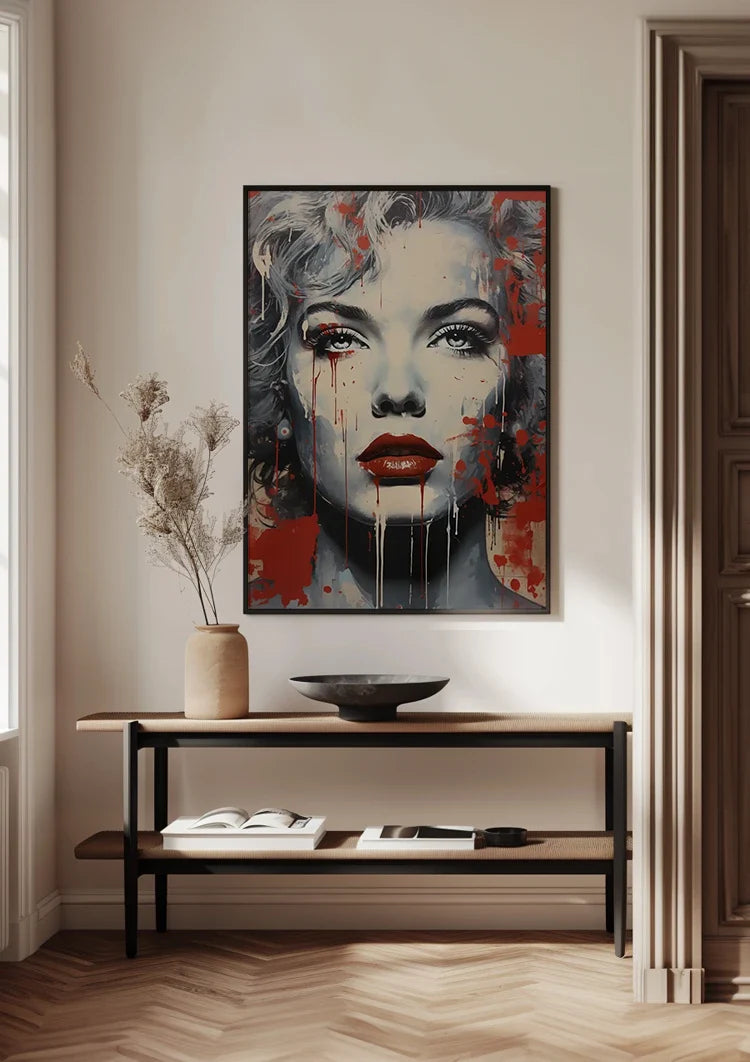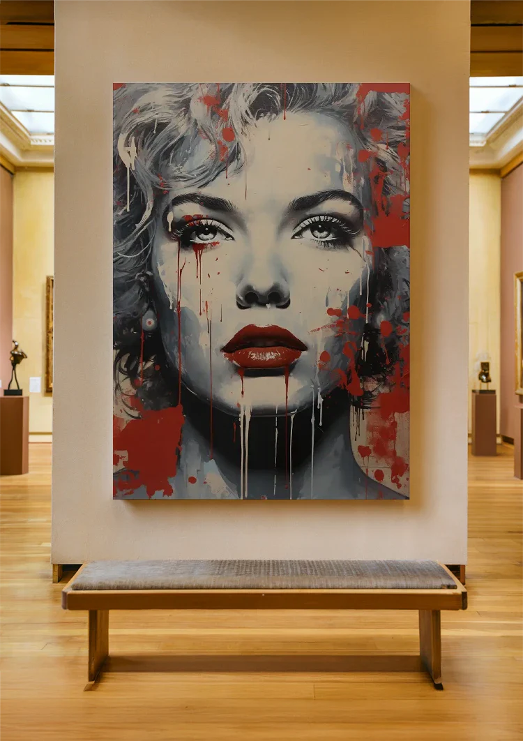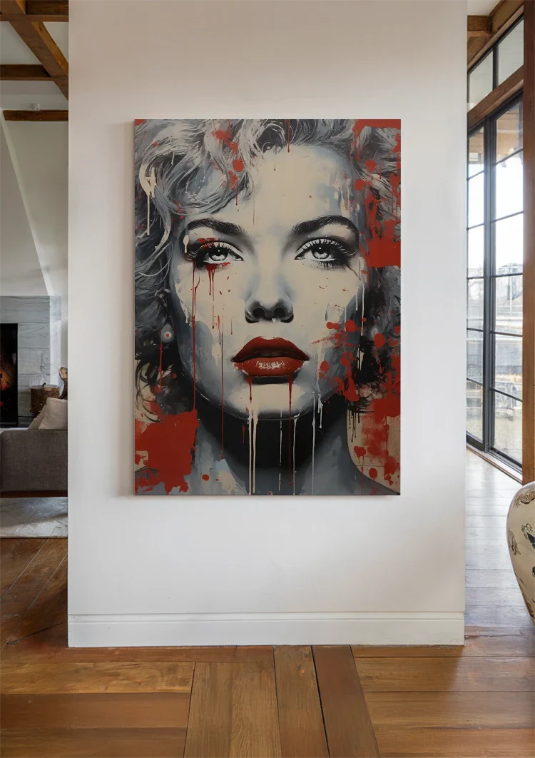Dieses Gemälde zeigt ein markantes Frauenporträt im Graffiti-Stil mit leuchtend roten Lippen, verschmierter Augenpartie und Farbtropfen. Die kraftvolle Kombination aus Schwarz, Weiß und Rot verleiht dem Werk eine intensive, dramatische Ausstrahlung.