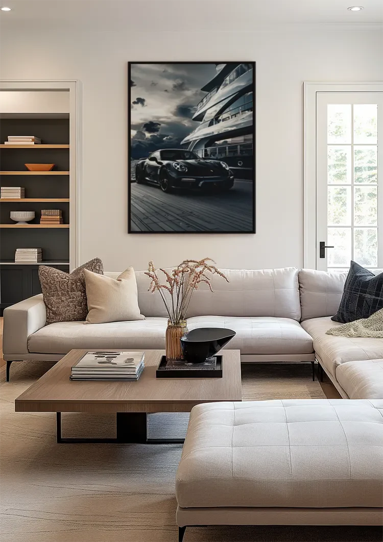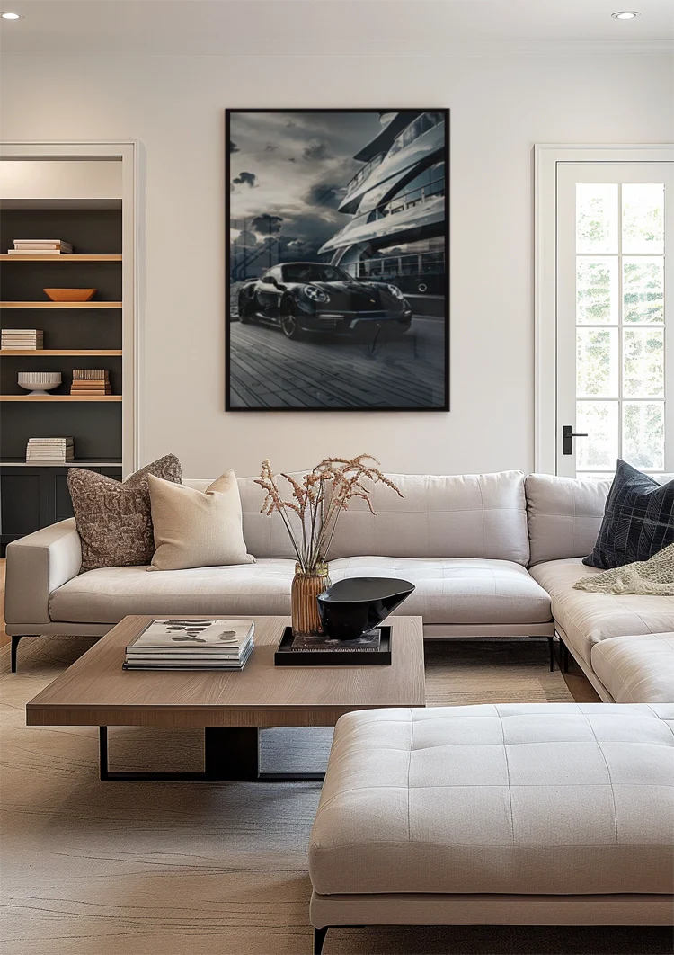This painting depicts a black Porsche 911 parked on a wooden pier next to an imposing luxury yacht, under a dramatically cloudy sky. The combination of sports car and yacht exudes ultimate luxury and exclusivity. The artwork is available on canvas, Dibond, and acrylic glass, and is custom-made in multiple sizes.