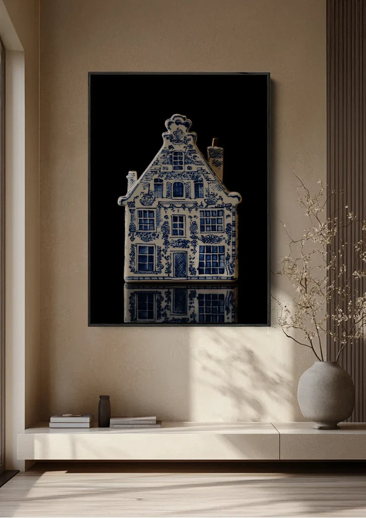 This painting depicts an ornate Dutch canal house rendered in traditional Delft Blue against a deep black background. The rich architectural details and characteristic blue and white patterns give the artwork a timeless and authentic appeal.