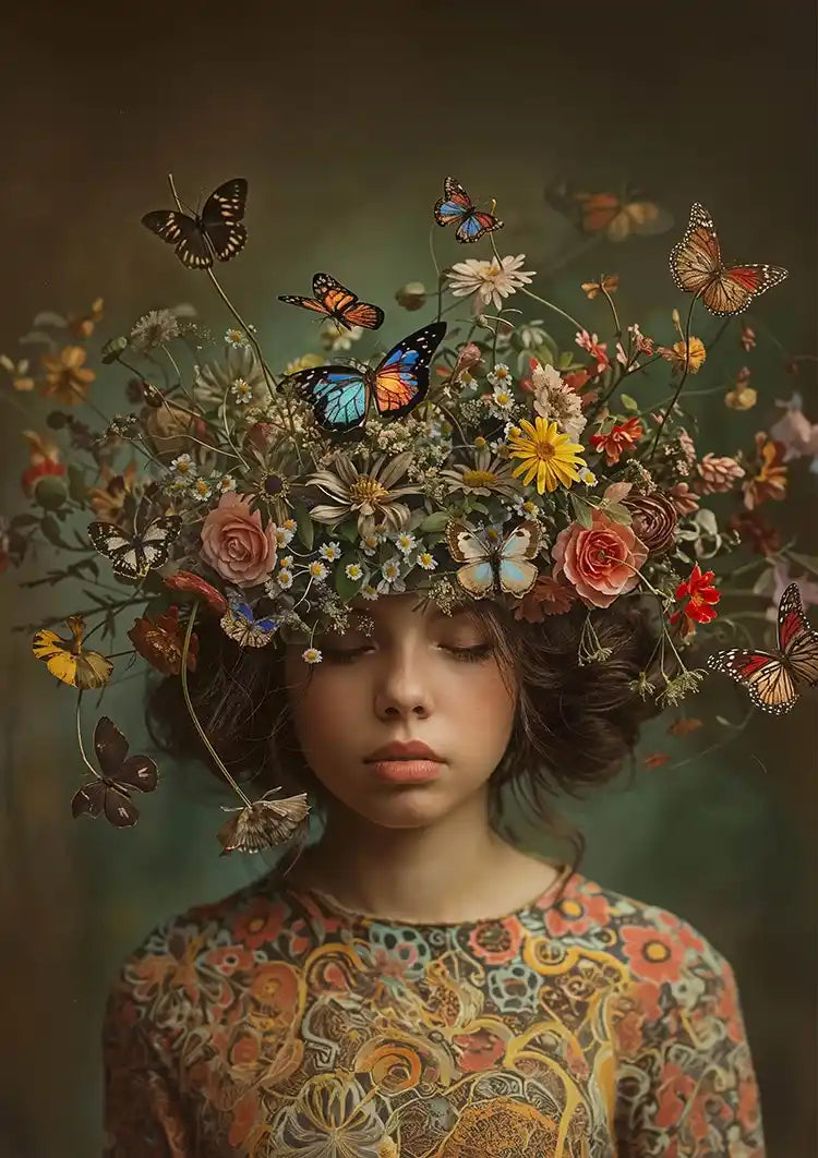 Girl with Flower Crown and Butterflies Dreamy Nature Portrait Painting