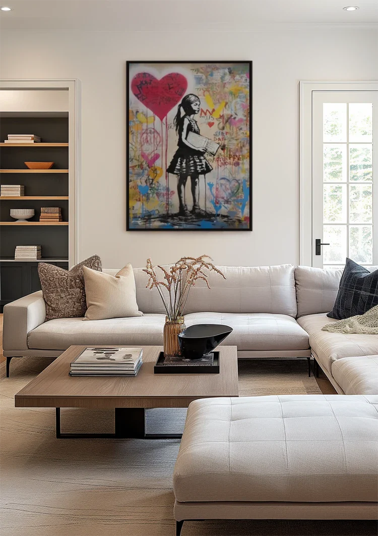 This painting depicts a girl in a black dress reaching up to a large red heart-shaped balloon, set against a vibrant background filled with colorful graffiti. The work is inspired by the iconic Banksy theme and exudes a childlike and poetic atmosphere. The work is available on canvas, dibond, and acrylic glass, and is custom-produced in multiple sizes.