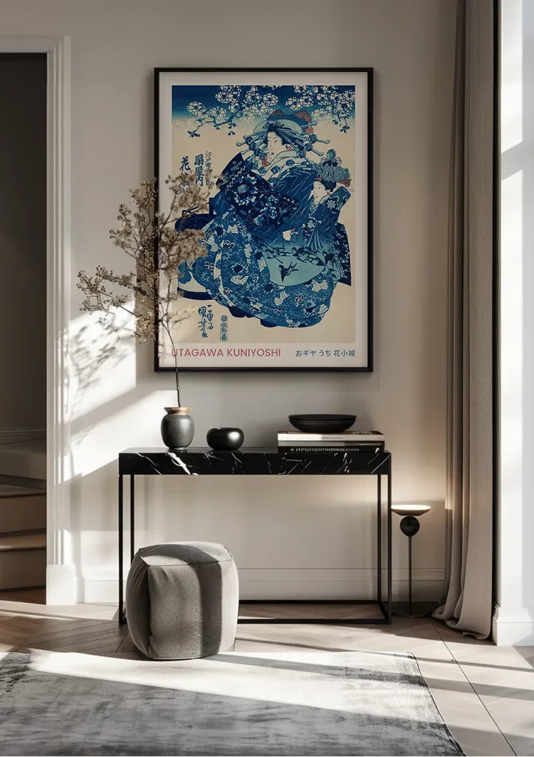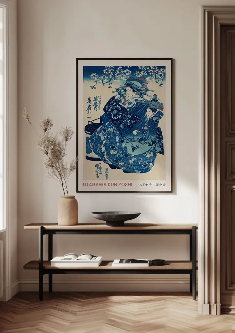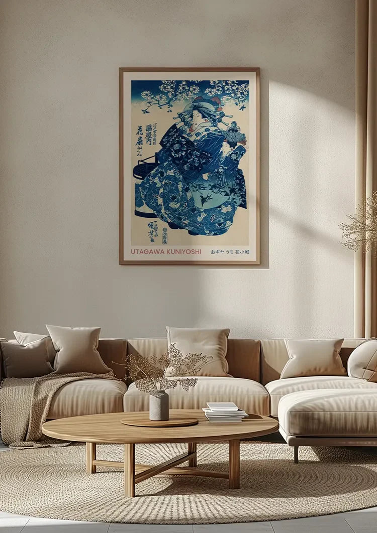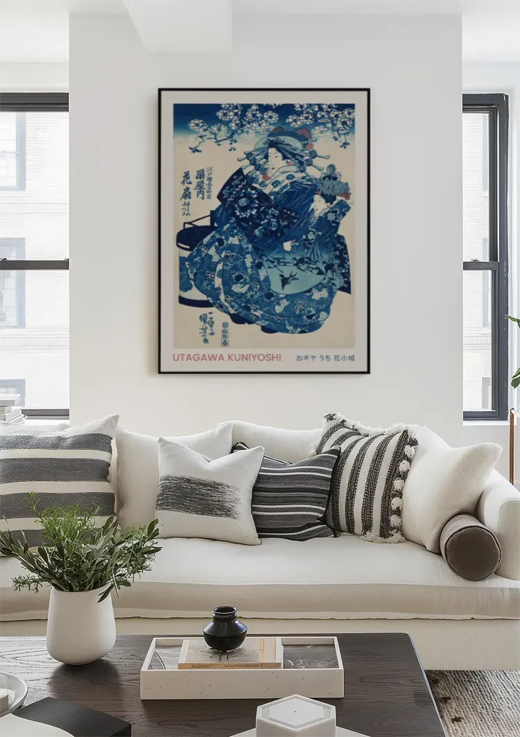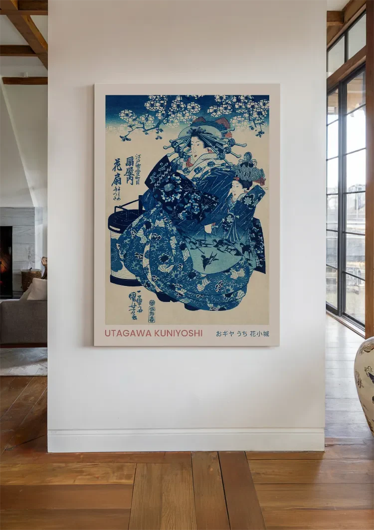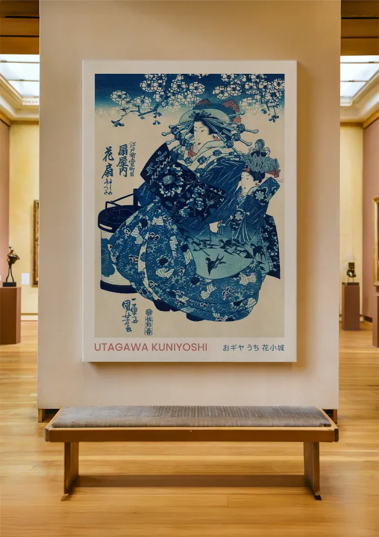 This painting depicts a woman in a lush blue kimono holding a fan, in the style of the Japanese master Utagawa Kuniyoshi. The composition exudes elegance and tradition in the classic woodcut style. The work is available on canvas, Dibond, and acrylic glass, and is custom-produced in multiple sizes.