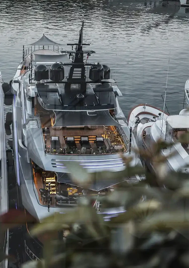 This painting depicts a luxurious white motor yacht moored in calm water, photographed from a bird's-eye view. The work exudes wealth and tranquility. The work is available on canvas, dibond, and acrylic glass, and is custom-produced in multiple sizes.