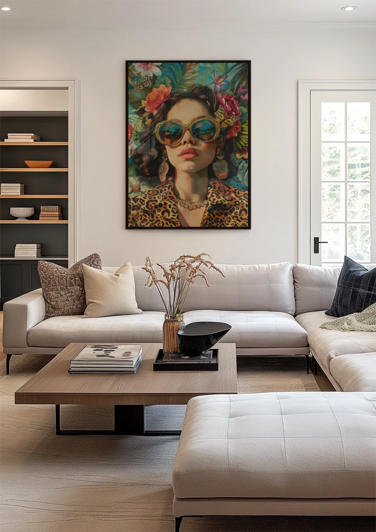 This painting depicts a woman with curly hair, a colorful floral headdress, and sunglasses against a tropical background filled with leaves and butterflies. The warm, exotic colors give this portrait a striking appearance.